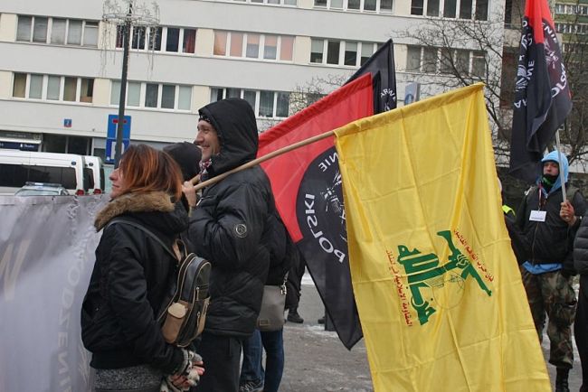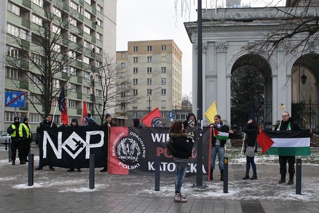 Kontr-akcję ad hoc zorganizowali działacze warszawskiego oddziału NOP. Nacjonaliści zebrali się pod kościołem pw. Wszystkich Świętych na Pl. Grzybowskim – naprzeciwko zbiórki żydujących. Obok transparentów i flag NOP , nacjonaliści przynieśli również fagi walczącego z żydowską okupacja Palestyny Hezbollahu. Były tez oczywiście okrzyki i przemowy o zbrodniach izraelskich, o których głucho w mediach głównego ścieku.