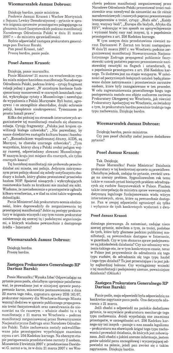 12.04.2007: Atak na NOP w Sejmie R.P.W czwartek 12. kwietnia, w trakcie 39. posiedzenia Sejmu, poseł SLD Janusz Krasoń zaatakował Narodowe Odrodzenie Polski, żądając od ministra sprawiedliwości rozprawienia się z z "faszystowskim NOP". Krasoń nie ograniczył się do epitetów, ale poszedł krok dalej dopuszczając się przestępstwa z art. 212 kk (świadome znieważenie). Uczynił to z premedytacją, broniąc swoich towarzyszy partyjnych, biorących udział w zbrojnym napadzie na wrocławską manifestację Narodowego Odrodzenia Polski ( 21.03.2007 - patrz wiadomości). Sam Krasoń to typowy bolszewicki beton - był członkiem komunistycznej PZPR do ostatniego dnia jej bandyckiego żywota. Antynopowskie wystąpienie miało i drugiego autora - również posła SLD, Wacława Martyniuka. Ten z kolei w czasach sowieckich "robił w związkach zawodowych", jako osoba numer dwa komunistycznej przybudówki. Ostatnio często występuje w mediach, a to za sprawą obrony "umoczonej" w aferę korupcyjną posłanki SLD, Ostrowskiej. Jak informuje Biuro Informacyjne NOP, władze partii zwrócą się do Marszalka Sejmu, Marka Jurka z żądaniem zdyscyplinowania komunistycznych pieniaczy i przeproszenia NOP za wygłaszane w Sejmie oszczerstwa. W wypadku niedopełnienia tego żądania podjęte zostaną przewidziane kodeksem karnym działania prawne. Stenogram sejmowy