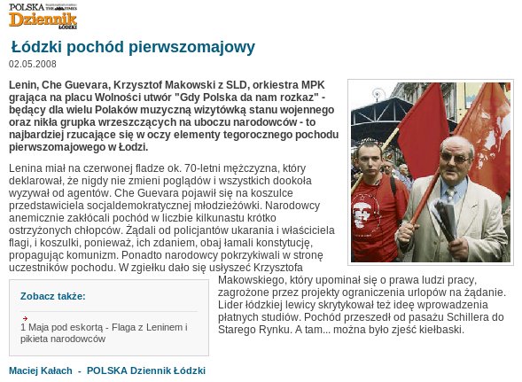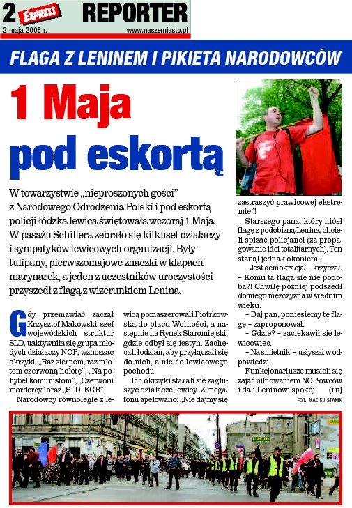 01.05.2008: Łódź: Niech się święci 1 maja!1 maja okazał się bardzo rozrywkowym dniem dla członków Dzielnicy Łódzkiej NOP. Tradycyjnie już, czerwona horda zebrała się w centralnym punkcie miasta, by zamanifestować swą tęsknotę za czasami ogólnonarodowej hańby i wstydu. Tym razem jednak lewacy nie zawiedli organizacyjnie. Według różnych szacunków w pochodzie udział wzięło ok. 500 sympatyków lewicy. Jednak naiwni byli Ci, którzy myśleli, że przy takiej okazji zabraknie łódzkich nacjonalistów. Dodatkowe atrakcje zapewniła także policja , która tym wykazała się nadzwyczajną nadgorliwością, zatrzymując kontrmanifestantów już w drodze na miejsce akcji. Po krótkim czasie wszystko się wyjaśniło i grupa narodowych - radykałów mogła przystąpić do działania. Naprzeciw czerwonej zarazie stanęło ok. 40 osób : członkowie i sympatycy NOPu oraz ONRu, grupa Sieradzkich Narodowców, a także niezrzeszeni sympatycy nacjonalistów. Rozwścieczeni widokiem tak dużej liczby lewaków radykalni antykomuniści dali z siebie wszystko, z dużym sukcesem zakłócając to haniebne zgromadzenie. Okrzyki : ?Raz sierpem, raz młotem w czerwoną hołotę !?, ?SLD=KGB !? oraz ?Katyń ? zawsze pamiętamy!? szybko przykuły uwagę mediów i przechodniów. W ten sposób cała uwaga skupiła się na nacjonalistach, wyposażonych jedynie w megafon, transparenty i ulotki. Po raz kolejny NOP udowodnił, że pomimo przewagi liczebnej wroga potrafi się lepiej zorganizować. Kontrmanifestanci nie opuścili czerwonych także podczas samego marszu, siłą własnych gardeł zagłuszając ich chore hasła. Na uwagę (po raz kolejny) zasługuje zachowanie policji. Nacjonaliści co chwila nękani byli nakazem legitymowania się, podczas gdy lewacy bez żadnych problemów rozwinęli sztandar z Leninem! Już o czerwonych flagach, koszulkach z Ernesto Guevarą i odtwarzaniu ?Międzynarodówki? nie wspominając... Ogólnie rzecz ujmując ? cała akcja skończyła się naprawdę dużym sukcesem medialnym. O łódzkim NOPie pisały gazety, mówiło radio i lokalna tv. Raz jeszcze łódzcy nacjonaliści udowodnili, że czerwona Łódź już się skończyła!